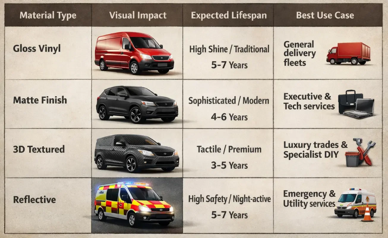 For trade services and high-tech industries, textures like carbon fiber or brushed aluminum are becoming the gold standard for Commercial Vehicle Signage and Wraps. These materials add a "rugged yet refined" look that traditional flat printing cannot replicate.