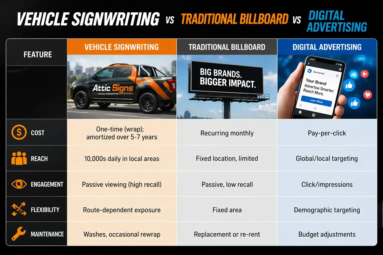 Google Ads or billboards charge recurring fees. In contrast, vehicle signwriting has a single upfront cost. After installation, there are no “per click” fees – your vehicle advertises on the road for years.